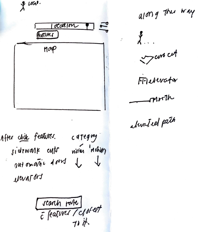 This was my first lo-fi prototype. In order for a user to choose a route, they started at the homepage and searched for a location-> applied accessibility filters-> then chose one route from several routes recommended. I realized the flow felt a bit overcomplicated, especially the part where users had multiple steps to reach one route. It wasn’t very intuitive so I kept iterating and simplifying the experience.