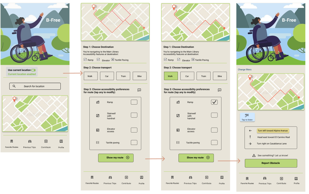 This was my second prototype. To help users choose a route, users started at the homepage where they can search for a location-> apply accessibility filters-> then shown a route based on their preferences. For this version, I chose to condense the mode of transportation and accessibility preferences into a single page to streamline the flow and make the experience more intuitive.